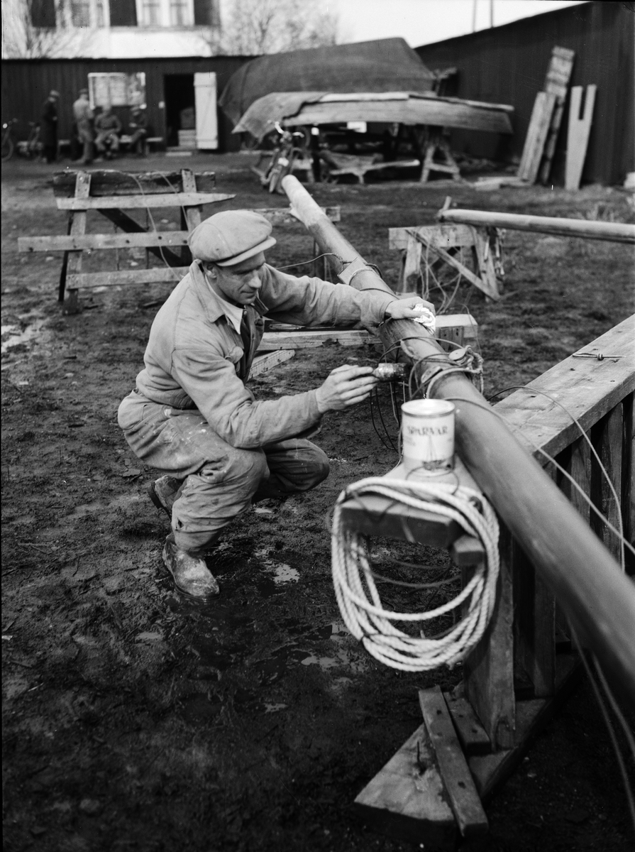 Målning av mast till segelbåt, Ekolns Segelklubbs varv, Kungsängen