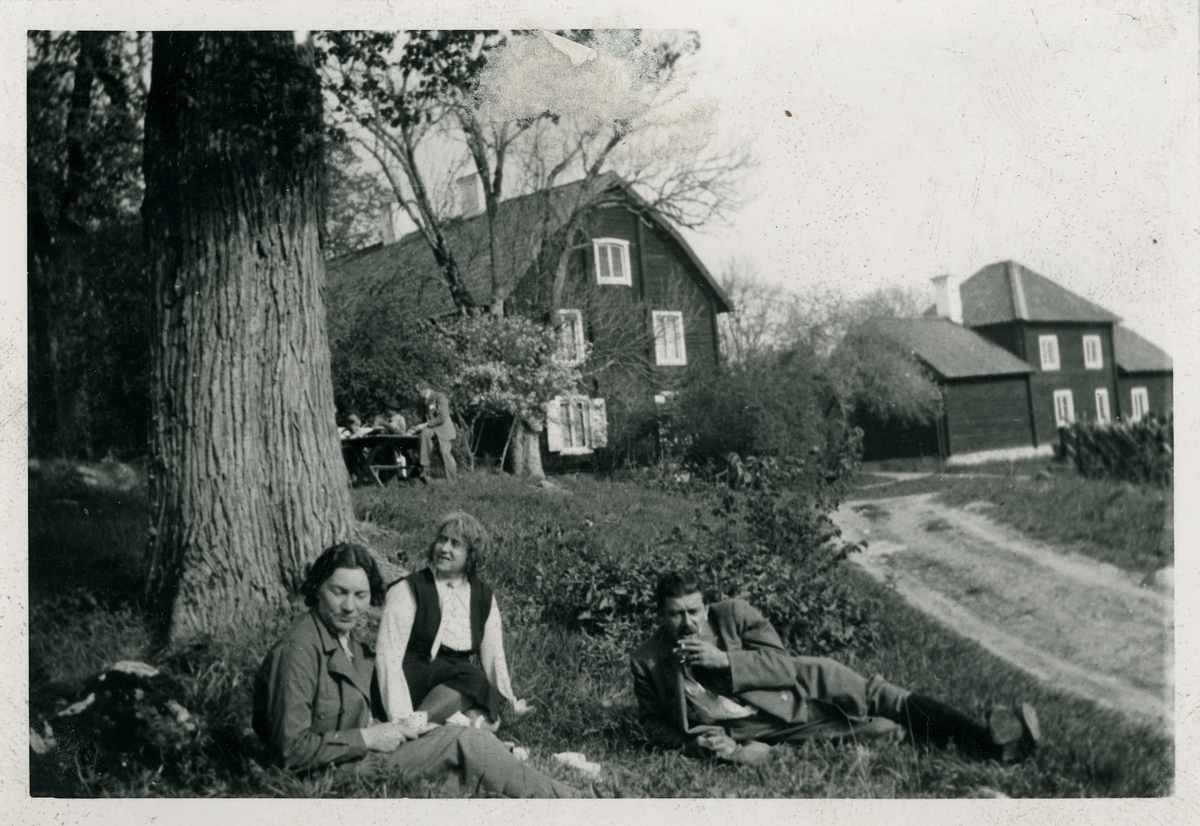 Olof Thunman sitter i gräset tillsammans med två kvinnor, Linnés Hammarby, Uppland 1937