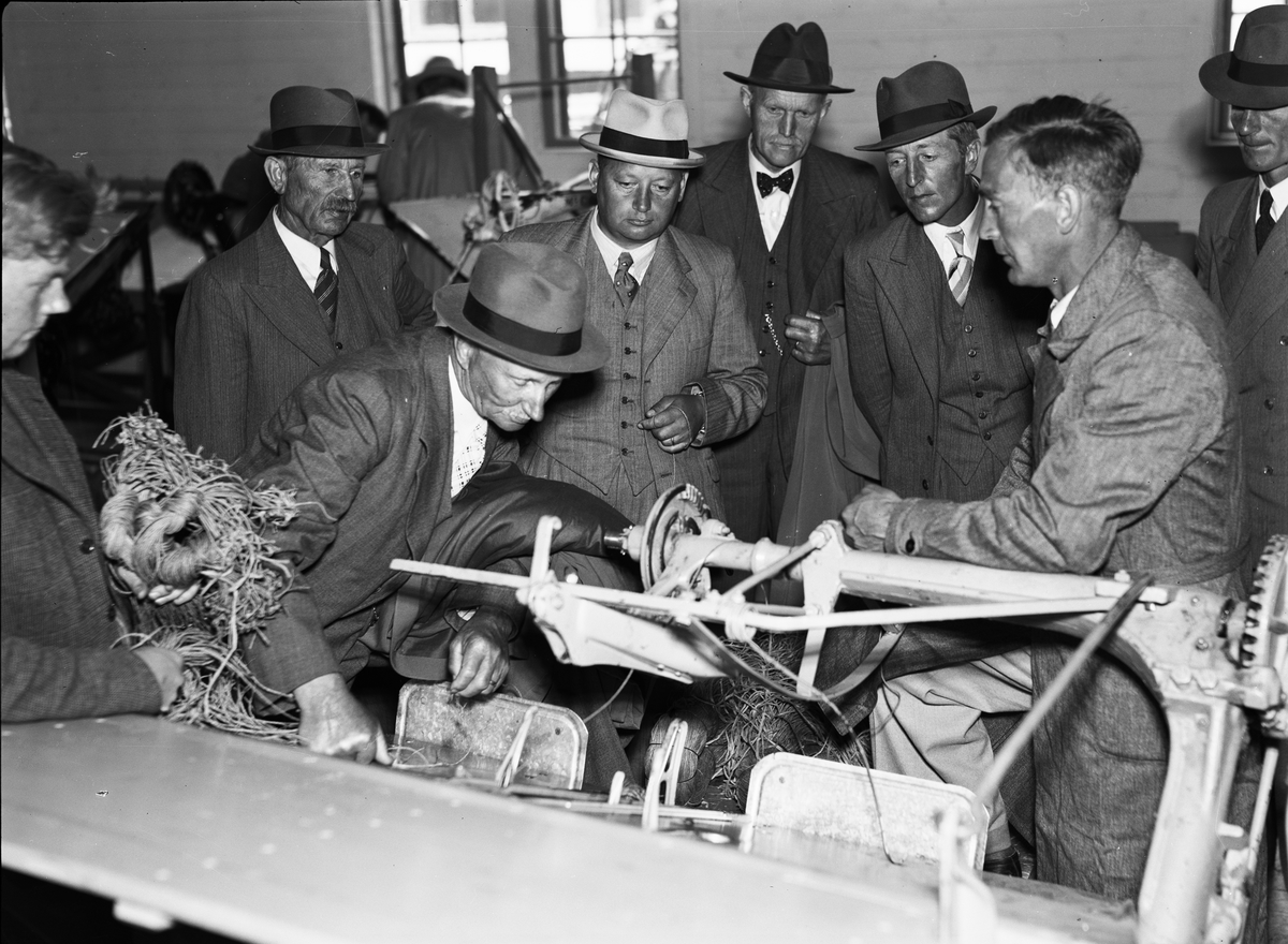 "Försöksdagen samlade sexhundra jordbrukare" - ingenjör N Berglund demonstrerar pappersskördegarn, Lantbrukshögskolan, Ultuna, Uppsala juli 1942