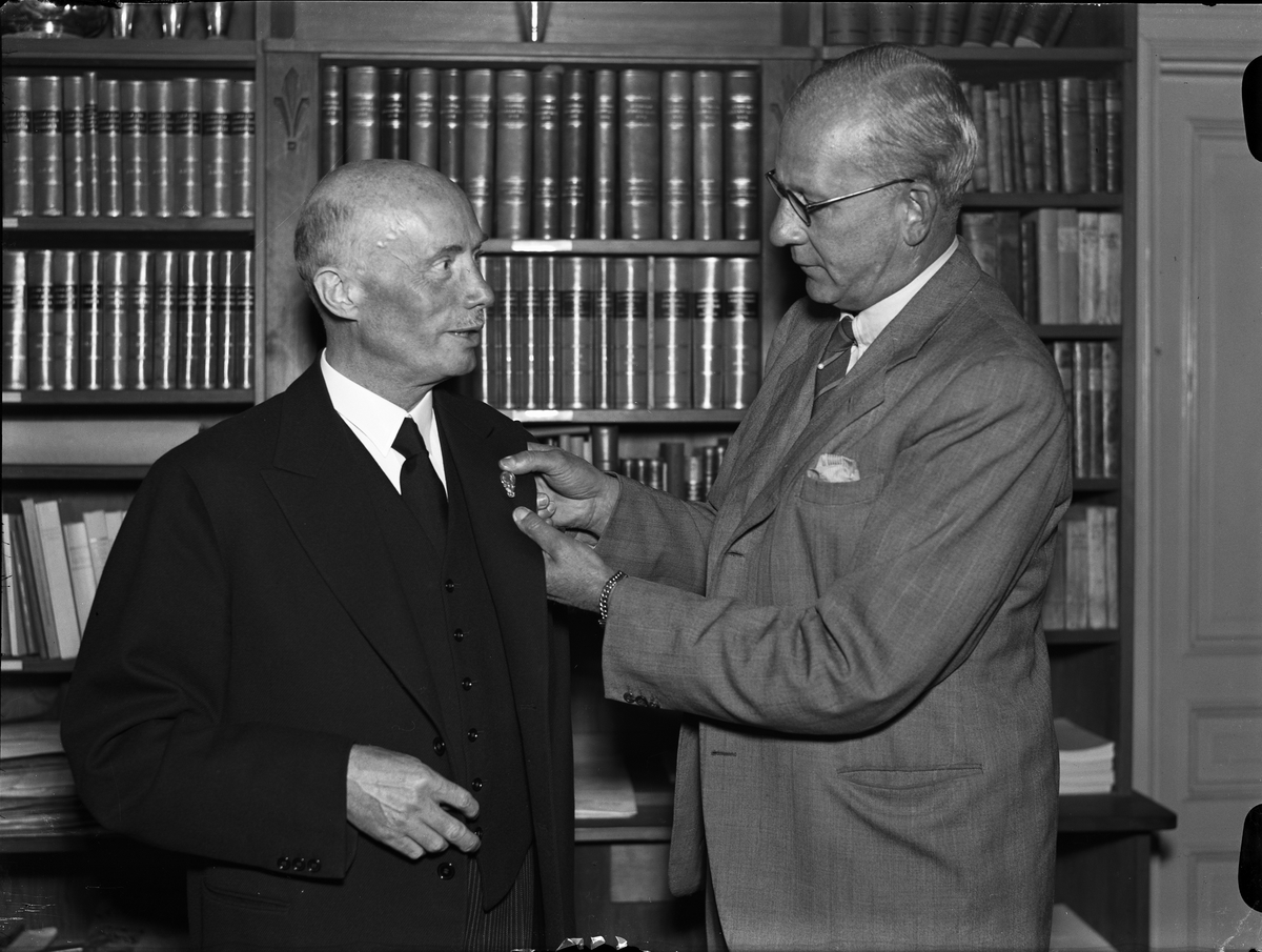 Distriktsordföranden i Uppsala läns JUF-distrikt, sekreterare Henrik Nystedt överlämnar ett förtjänstmärke i guld till bankdirektör J H Jönsson