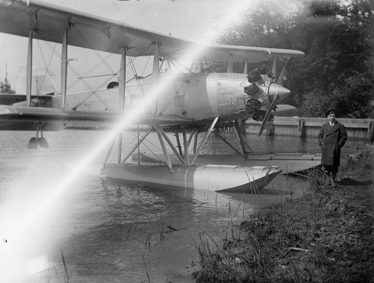 Man står vid sjöflygplan vid strand, sannolikt i Sverige