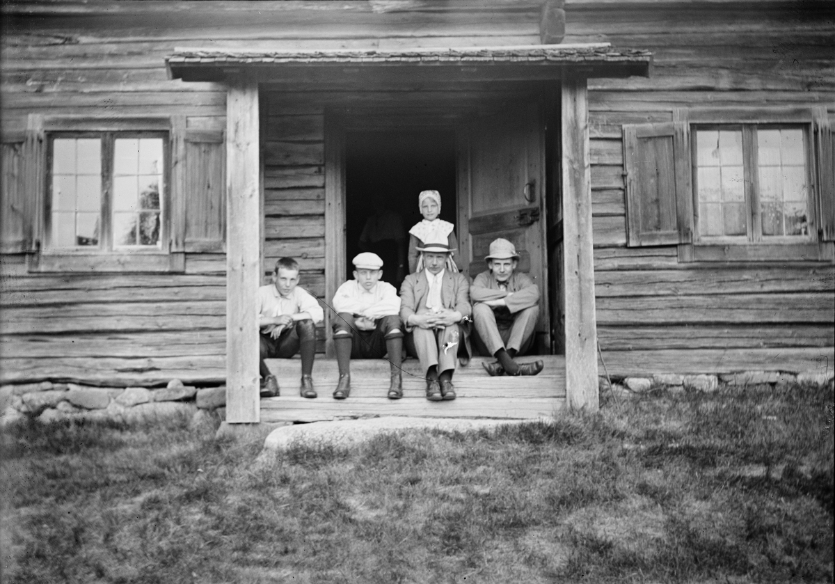 Tonsättare Ruben Liljefors sitter med sin dotter Marit samt sannolikt Alf, Ingemar och Roland Liljefors, på trappan framför bostadshus, sannolikt i Sverige