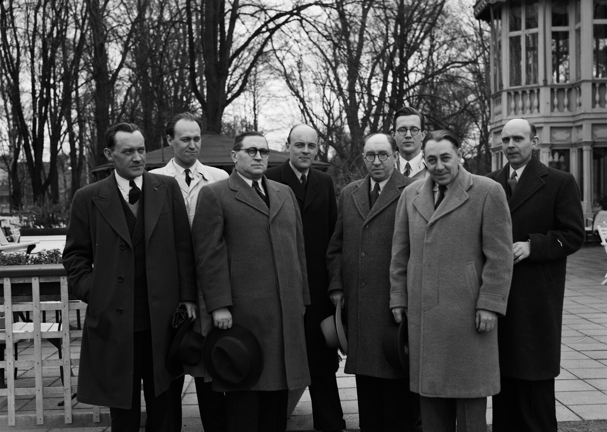 Grupporträtt - män, vid restaurang Flustret, Uppsala maj 1947