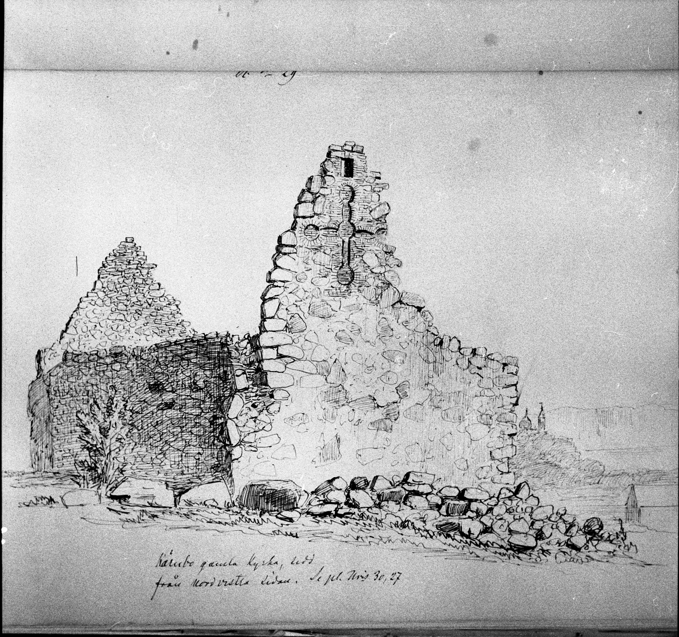 Kyrkoruinen mot nordväst. Foto efter teckning ur O. Hermelin: Selebo härad I, sidan 149.