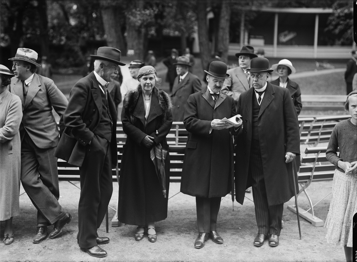 Stadsarkitekt Gunnar Leche, landshövdingskan Elisabeth Linnér, landshövding Sigfrid Linnér och okända män på invigningen av Upsala Fabriks- och Handtverksförenings utställning, utställningsområdet på Nedre Slottsgatan