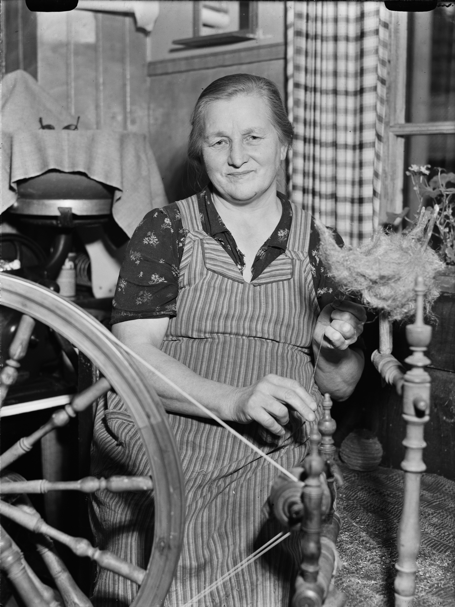 Jordbrukare Agnes Gustafsson vid spinnrocken, Jutbol, Rasbo