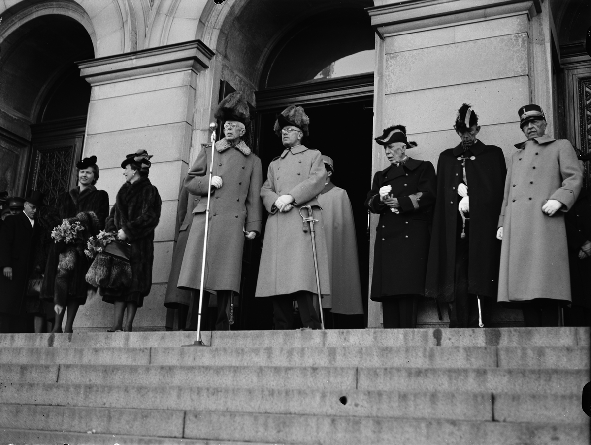 Kungligheter samlade på Universitetshusets trappa vid Uppsala Studentkårs hyllning