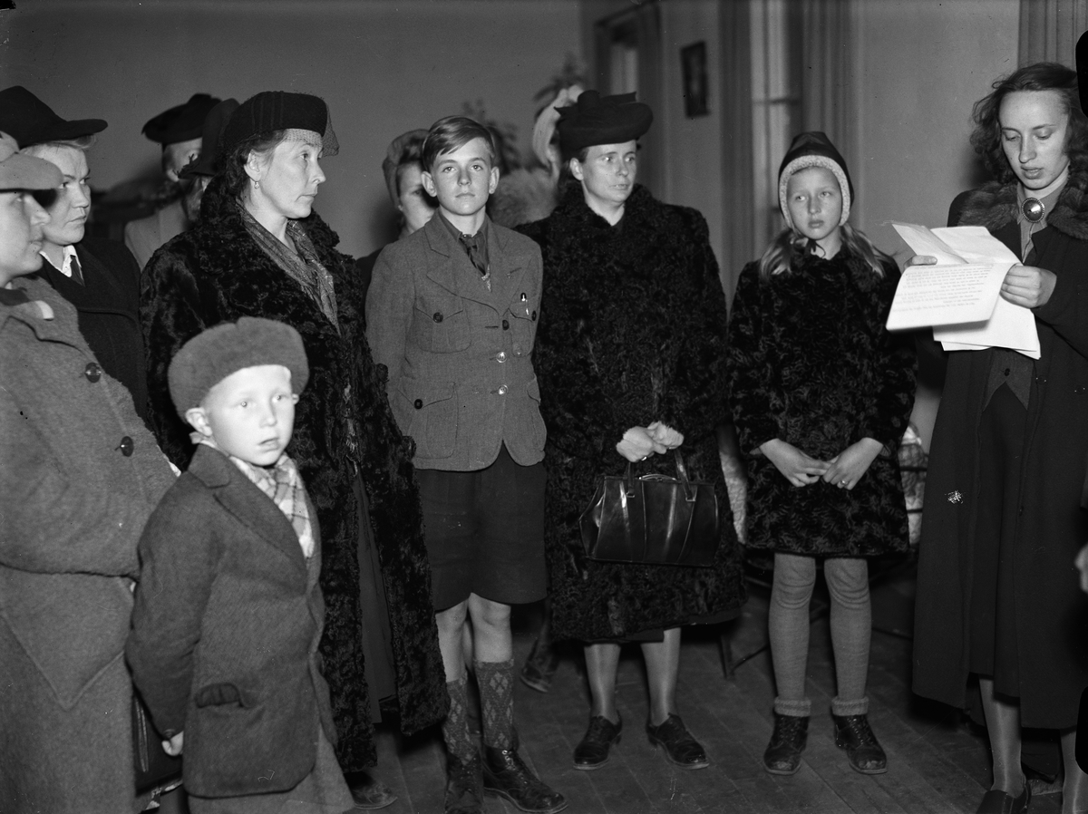 Tolken översätter landsfiskalens hälsning till flyktingarna på flyktingförläggningen i Gimo