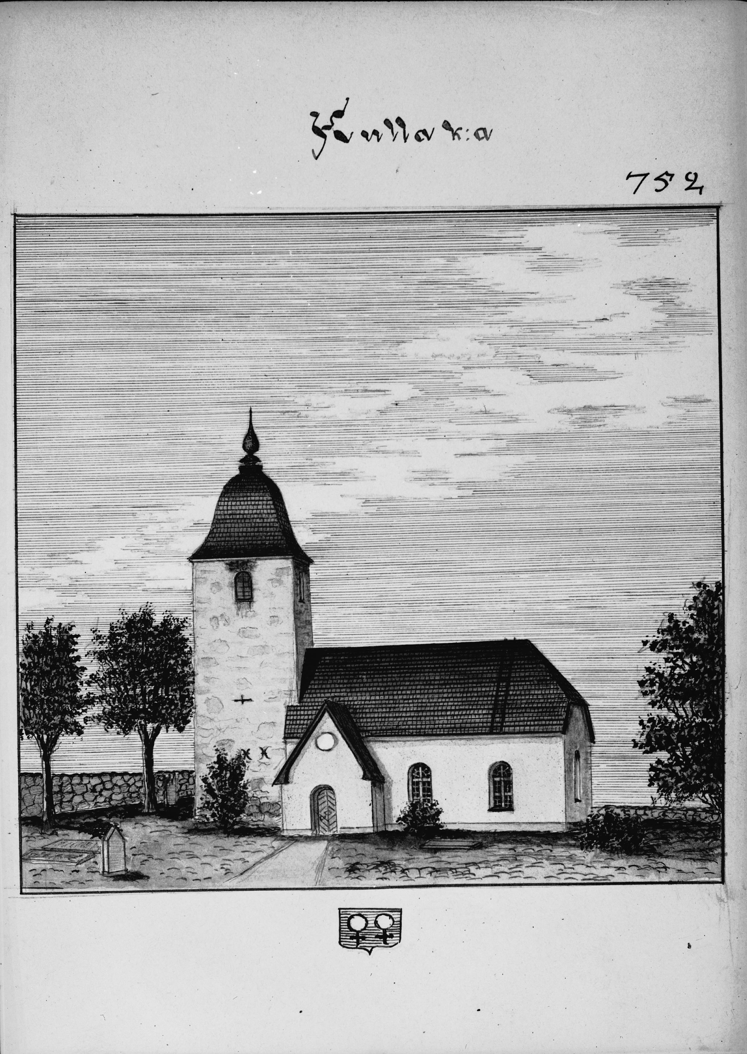 Kyrkan mot söder. Avfotograferad gravyr, Ihrfors, E. Uplandia Sacra, pars prima.