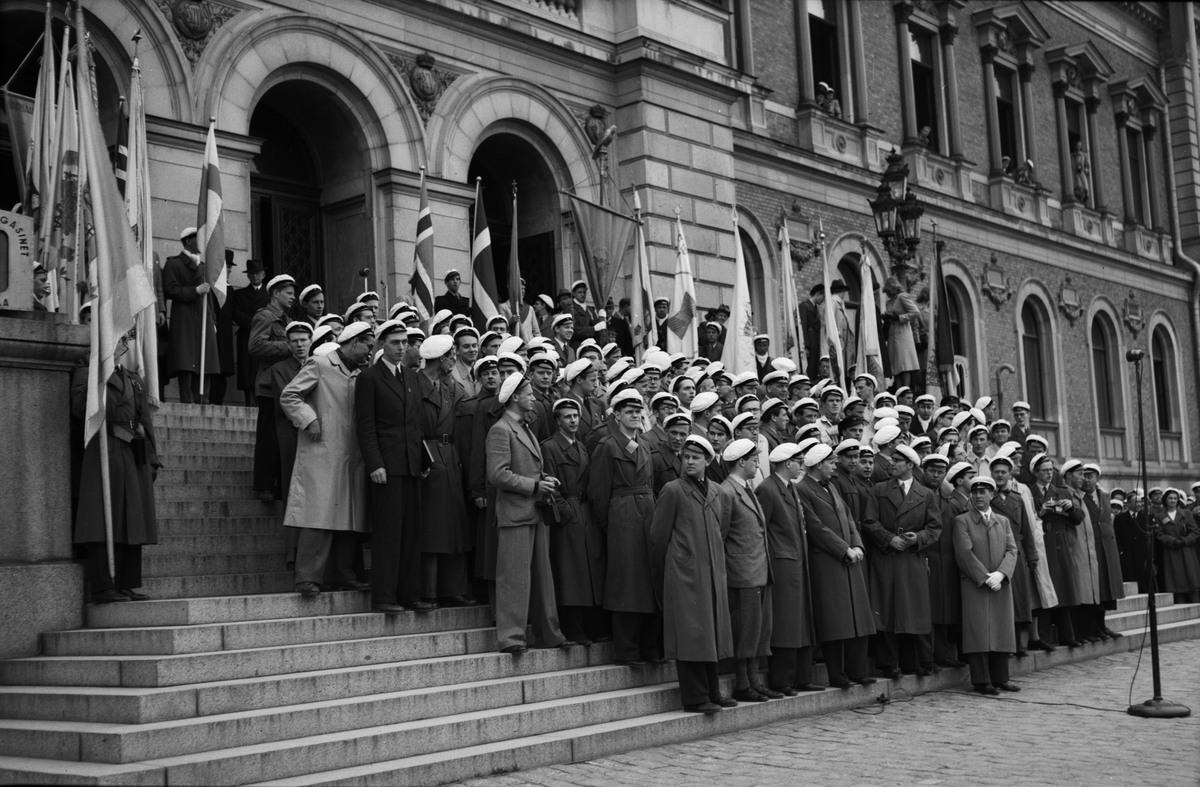 "Freden värdigt firad i Upsala", Allmänna sången på Universitetstrappan, Uppsala 8 maj 1945