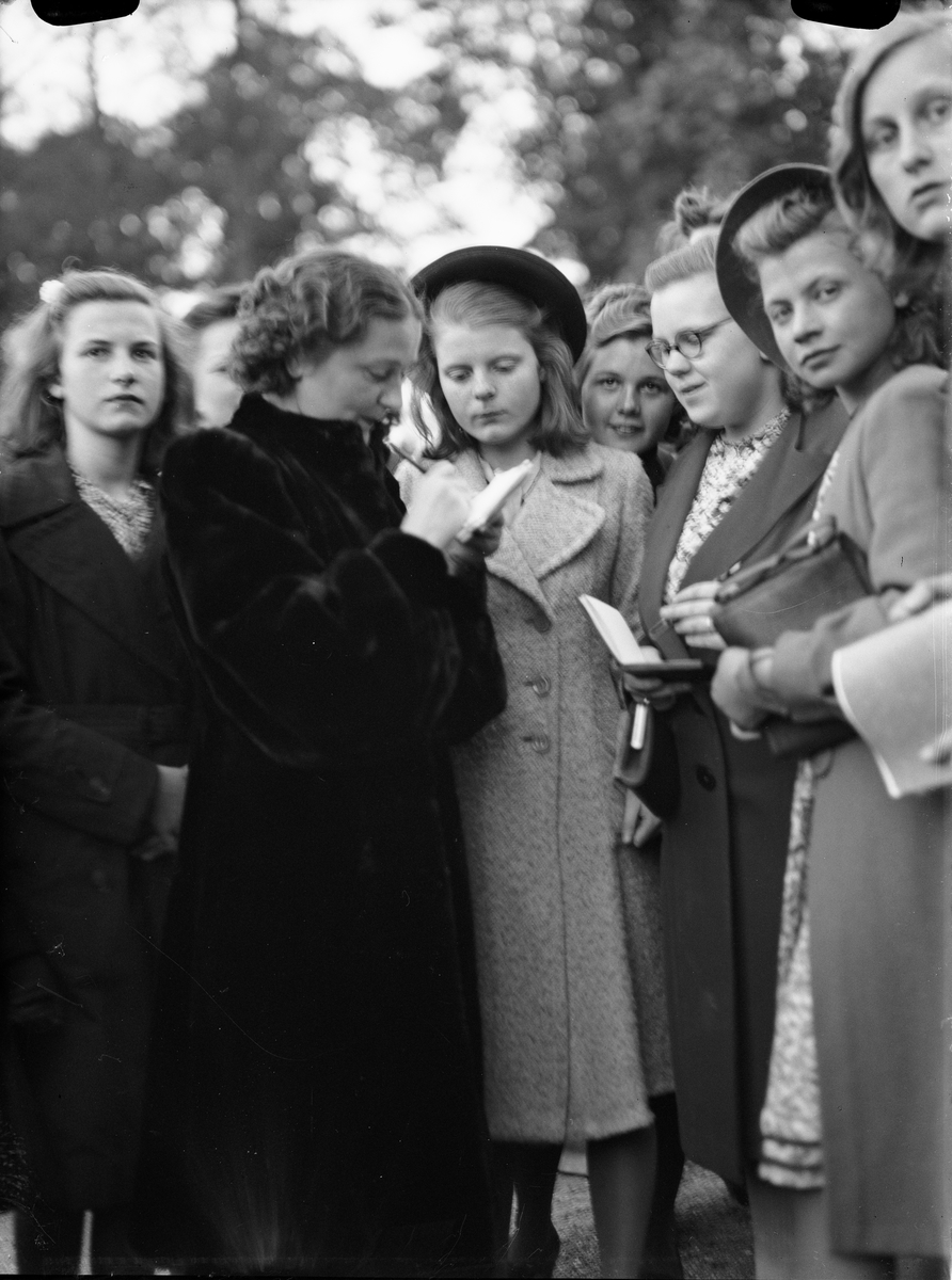 Operasångerskan Hjördis Schymberg skriver autografer på försvarsfesten i Botaniska trädgården