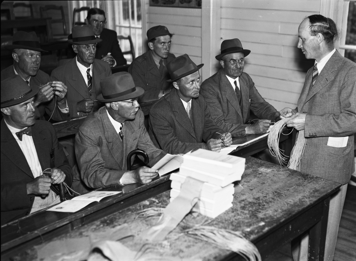 "Försöksdagen samlade sexhundra jordbrukare" - ingenjör N Berglund demonstrerar pappersskördegarn, Lantbrukshögskolan, Ultuna, Uppsala juli 1942