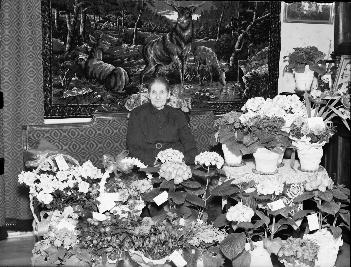 Kvinna i hemmiljö omgiven av blommor, Östhammar, Uppland,