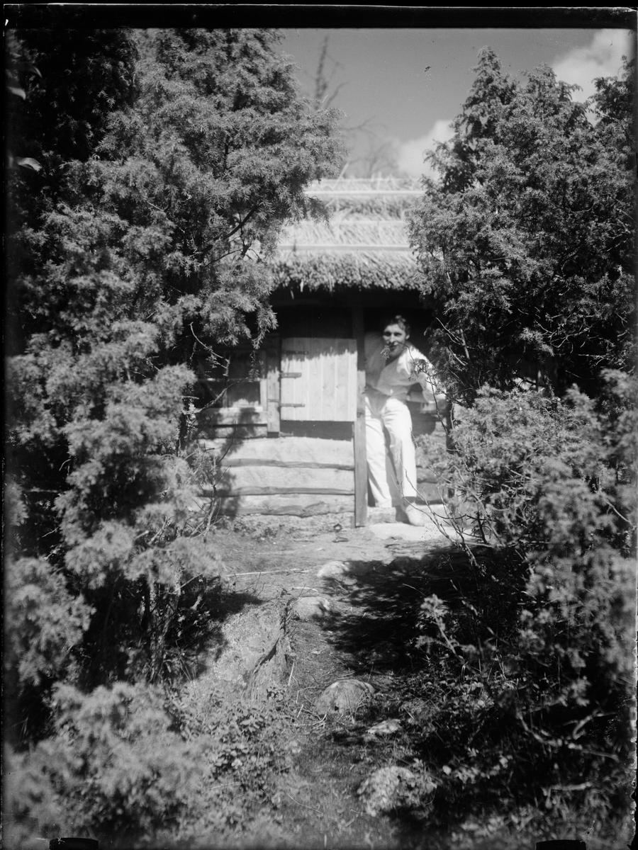 Man tittar ut från stuga, Östhammar, Uppland