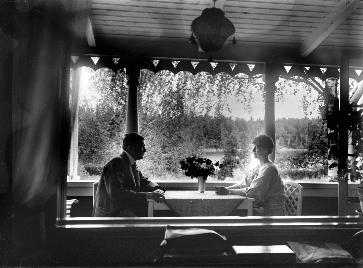 Anna och Carl Z Haeggström på verandan i sommarhuset, Marielund, Uppland