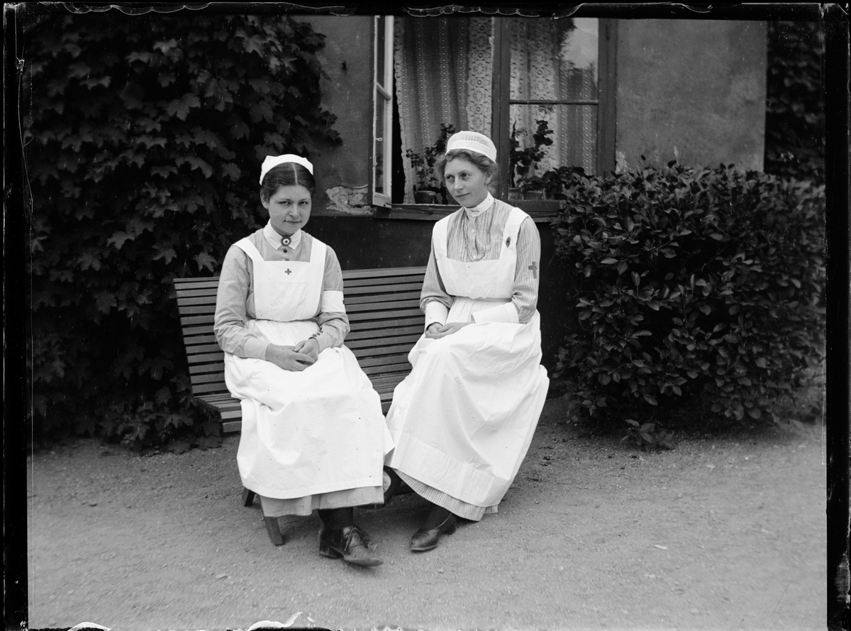 Sjukvårdspersonal sitter utomhus på en bänk, Östhammar, Uppland
