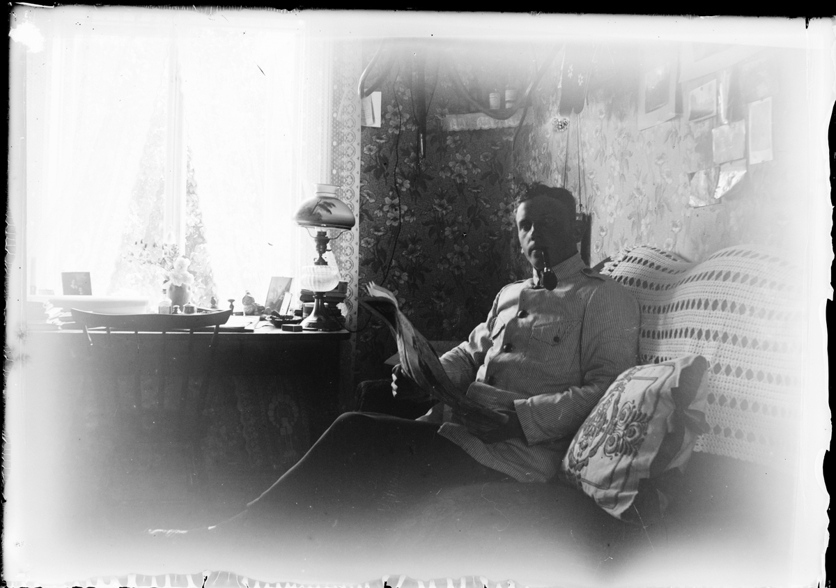 Man sitter i soffa med tidning och pipa, Östhammar, Uppland