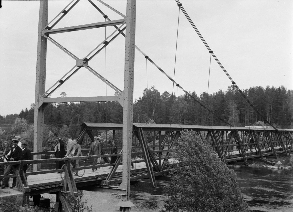 Medlemmar ur Upplands fornminnesförening och Naturskyddsföreningen promenerar på den s.k. Prästgårdsbron över Dalälven, Älvkarleby