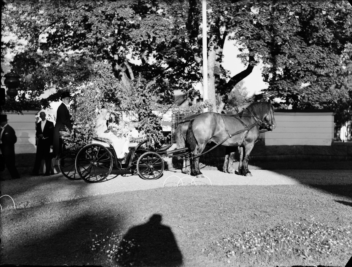 Brudpar åker med häst och vagn, Gimo herrgård, Uppland