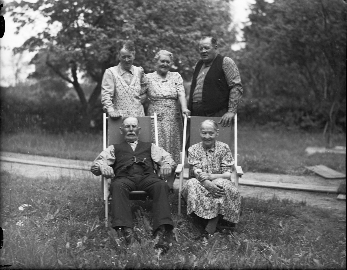 Tre kvinnor och två män i trädgården, Östhammar, Uppland