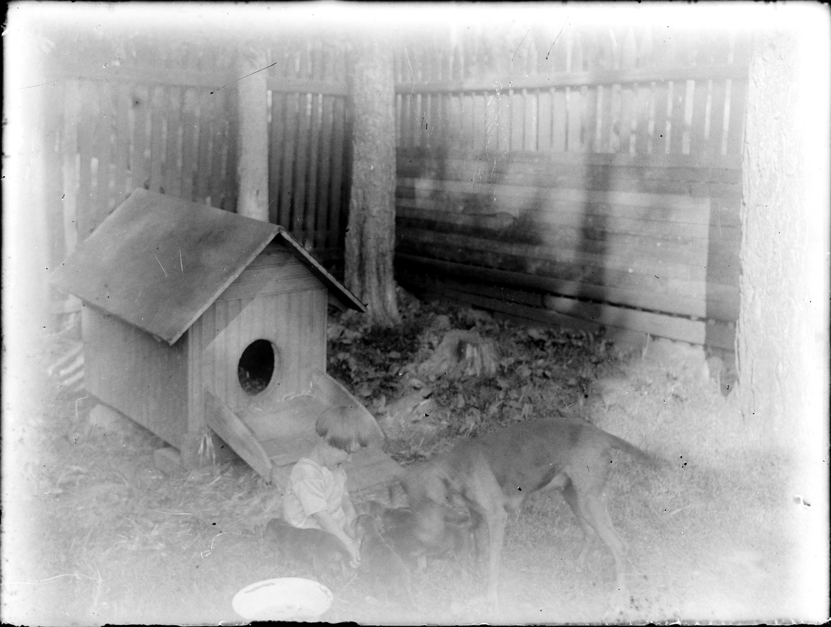 Barn med hundar vid hundkoja, Östhammar, Uppland