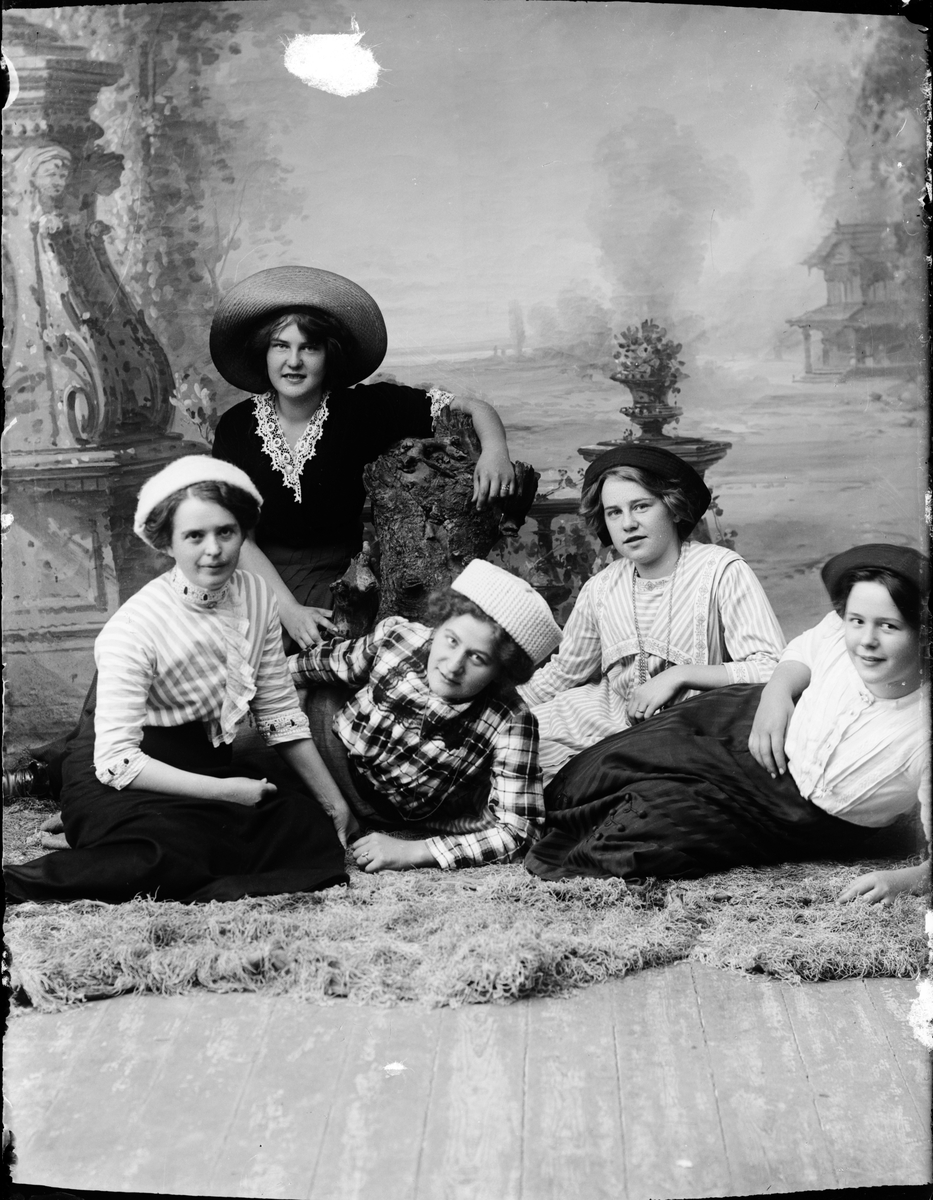 Ateljéporträtt - fem kvinnor klädda i hatt, Östhammar, Uppland