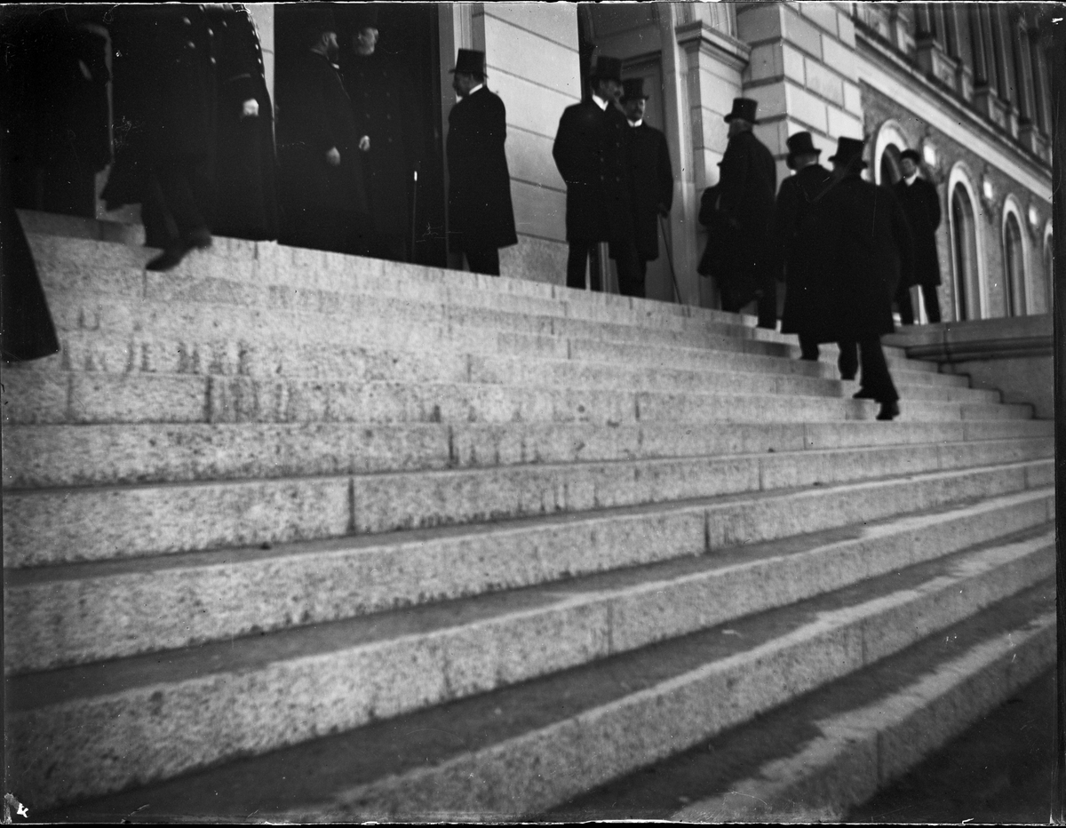 Herrar går upp för Universitetshusets trappa, Uppsala