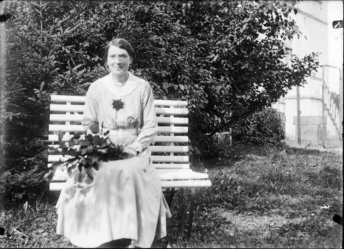 Kvinna sitter på en bänk med kvistar i handen, Uppland