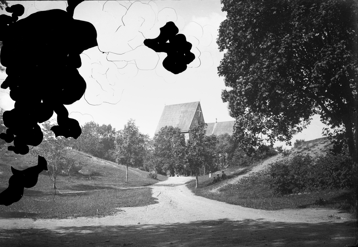 Titel: Delar av fornlämningsområdet i Gamla Uppsala. I fonden Gamla Uppsala kyrka, 1890