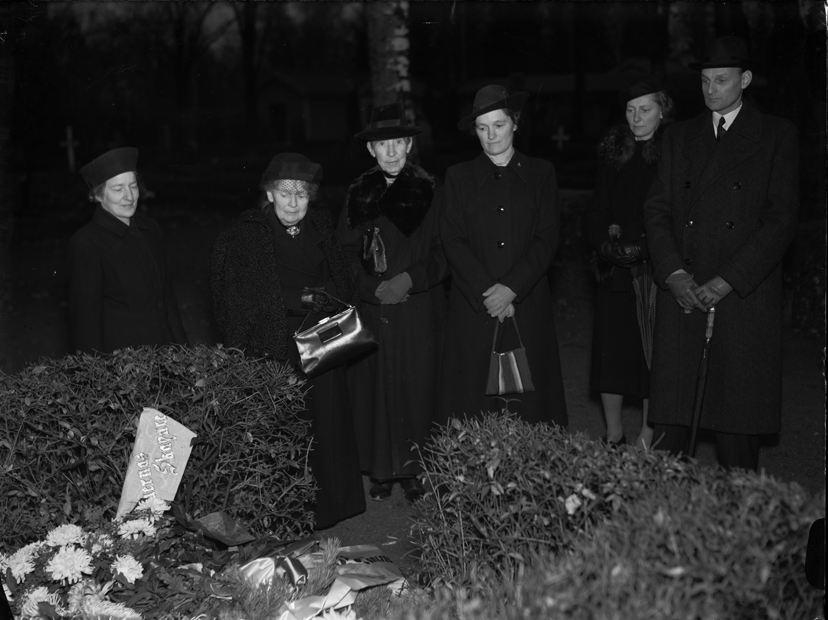 "Sjöbergs minne firat på 'Tonernas' födelsedag. Hyllning från Hedemora vid graven på Upsala kyrkogård", Uppsala gamla kyrkogård, 1942