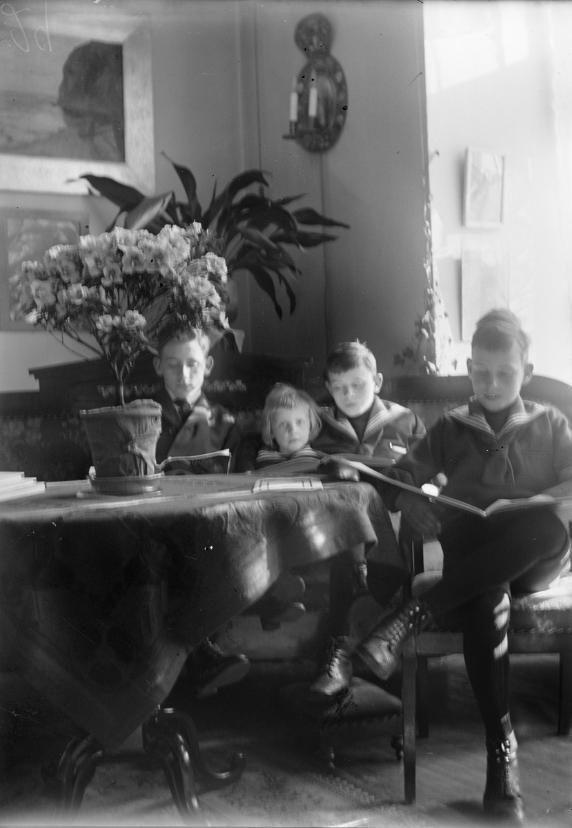 Ruben och Christiane Liljefors barn, Alf, Roland, Ingemar och Marit, sannolikt i hemmet i Sverige