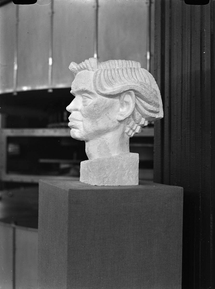 "Cyklotronen mäktigt vetenskapligt instrument. Stora hyllningar för prof. Svedberg vid invigningen" av Gustaf Werners institut för kärnkemi, Uppsala december 1949. Byst föreställande professor The Svedberg