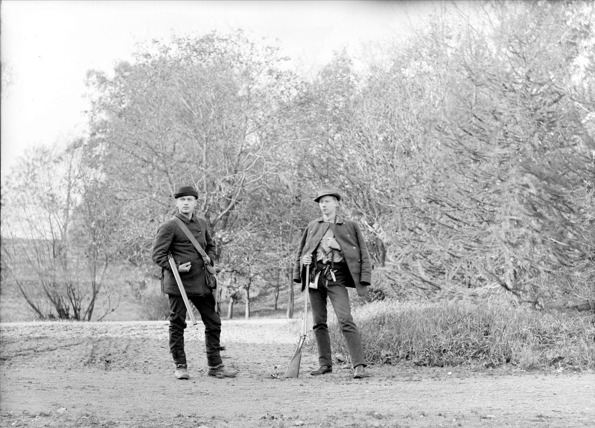 Ernst Grahnberg och Sven Unander jaktklädda med bössor i parken vid Ultuna lantbruksinstitut, Uppsala 1889