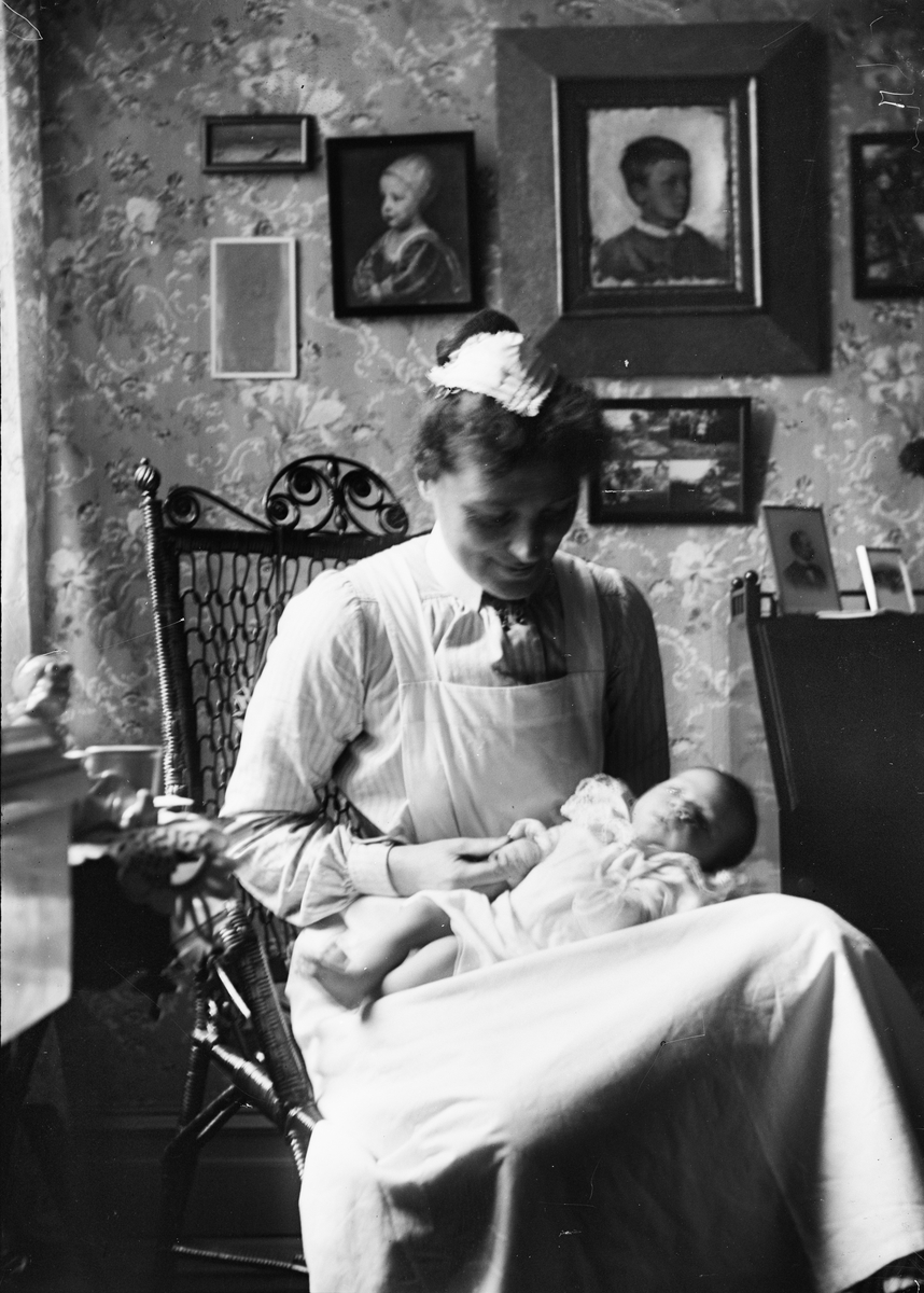 Kvinna med spädbarn i famnen i hemmet, sannolikt i Sverige