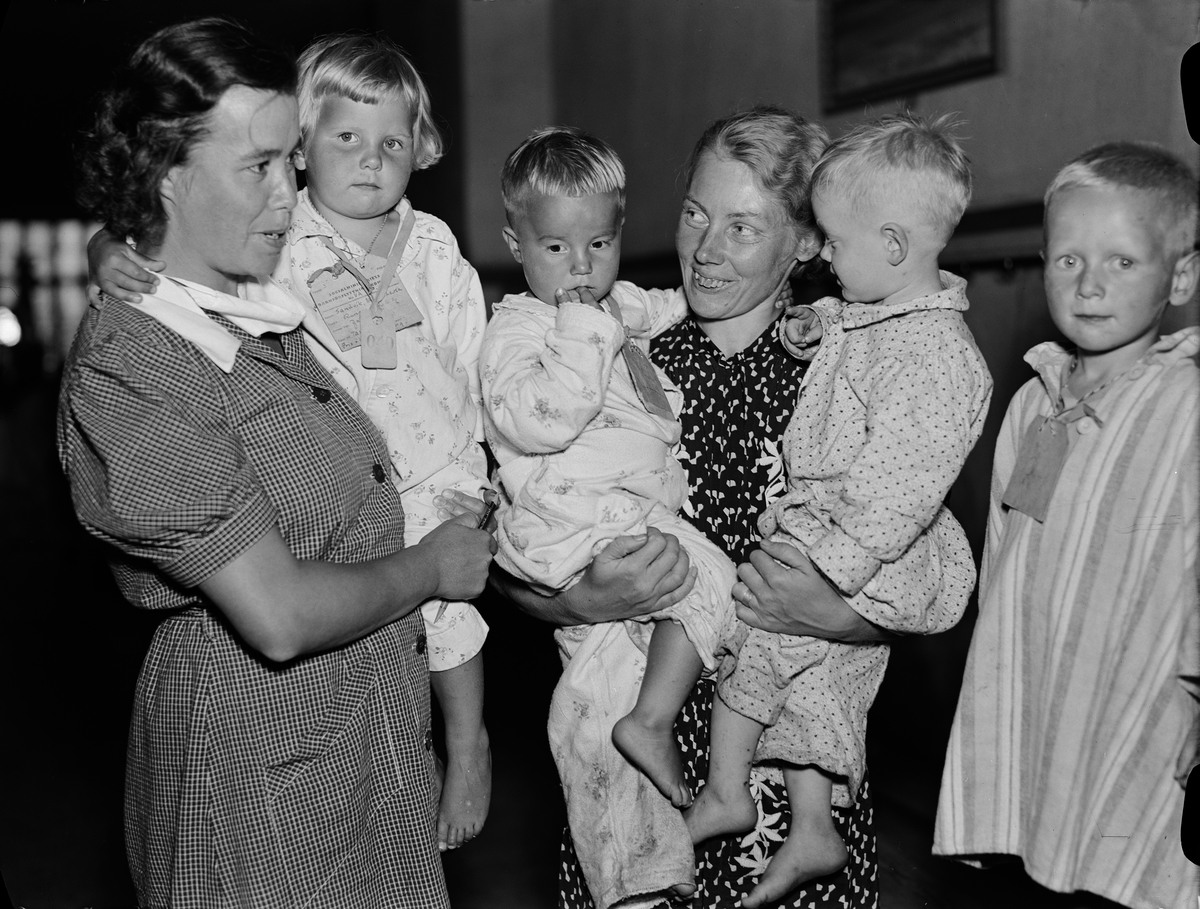 Ruth Tideström och "fröken" Nykänen med karelska flyktingbarn, flyktingförläggningen i Vaksalaskolan