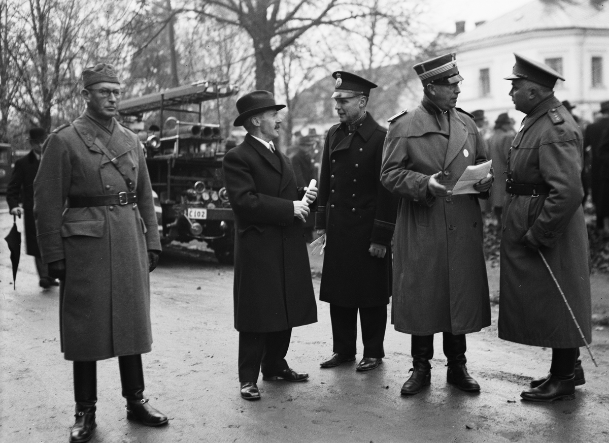 "Överraskningsmoment satte beredskapsavdelningarna på hårda prov" - landshövding Sigfrid Linnér samtalar med polismästare Hans Eriksson under beredskapsövningen, Uppsala 1941
