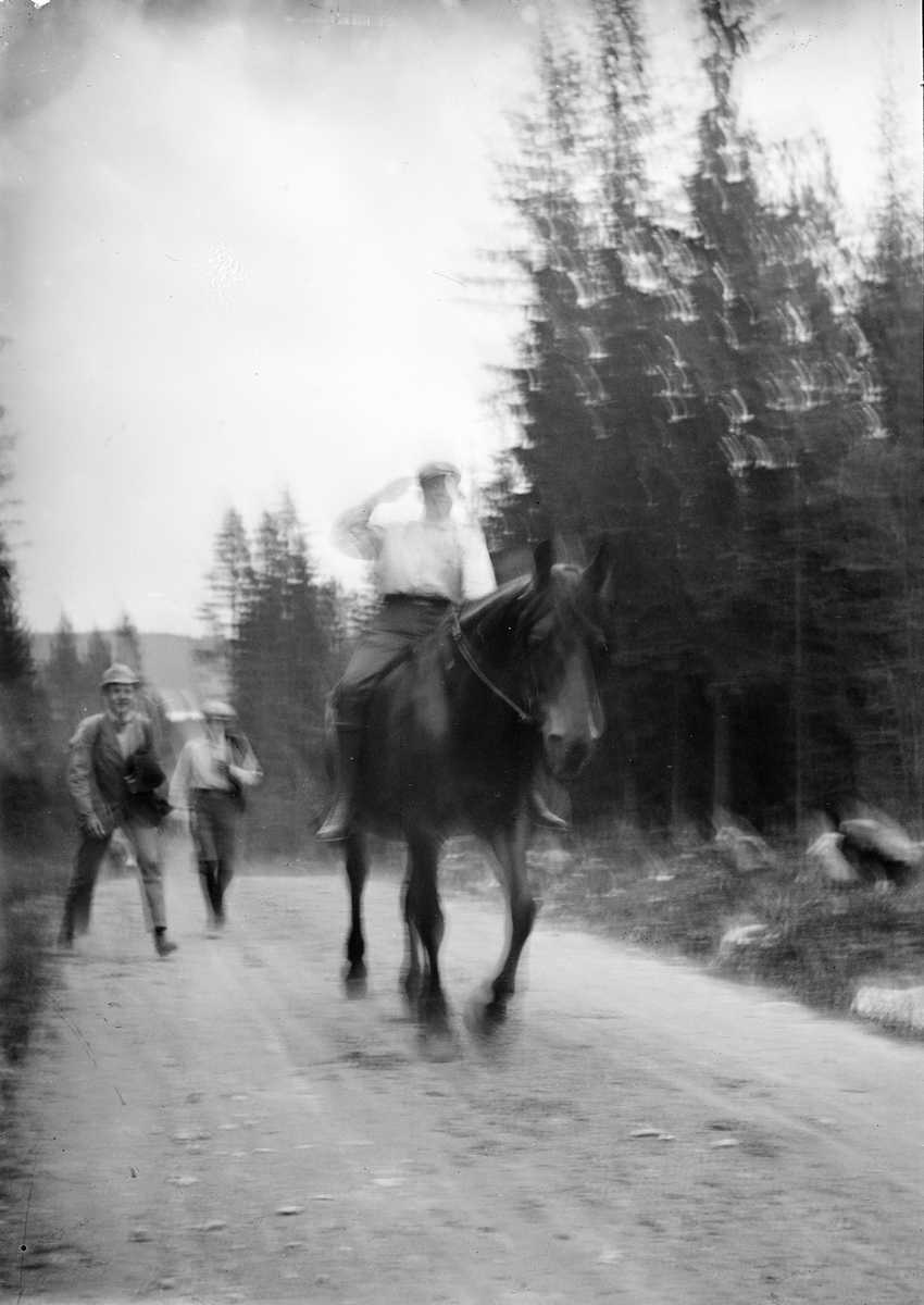 Man rider på häst på skogsväg och två män promenerar efter, sannolikt i Sverige
