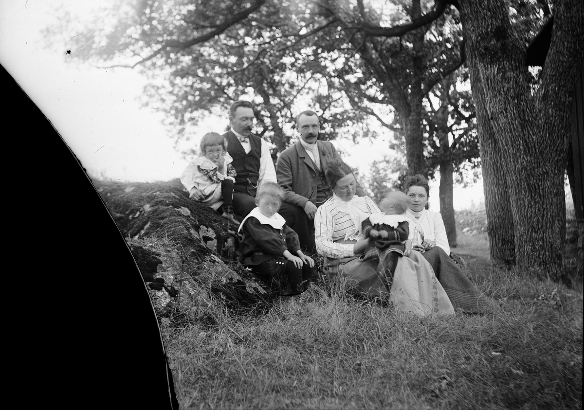 Ruben och Christiane Liljefors samt Carl och Elin Liljefors med några av deras barn sitter ute i naturen, sannolikt i Sverige
