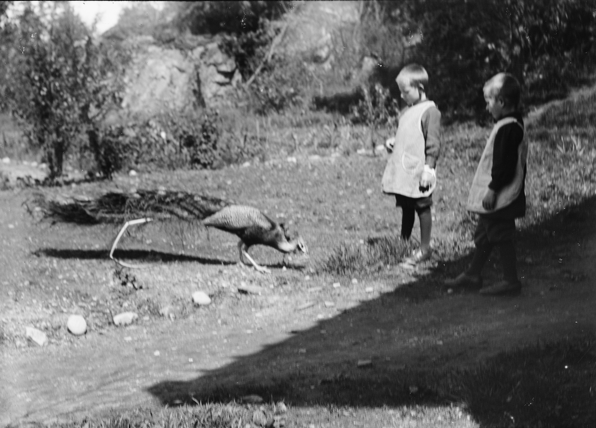 Sannolikt två av Ruben och Christiane Liljefors söner matar en påfågel ute på gården, sannolikt i Sverige