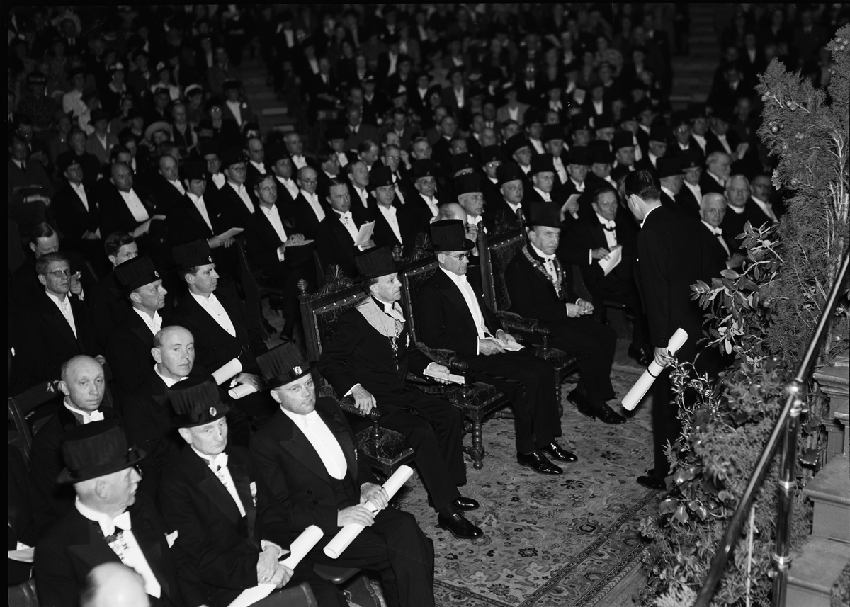 "Prokanslern, kanslern och rector magnificus, omgivna av promovendi", doktorspromotion i Universitetsaulan