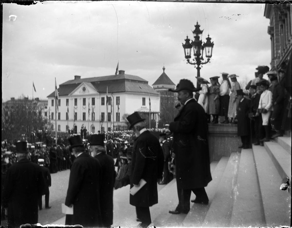 Herrar i hög hatt på Universitetshusets trappa, Uppsala