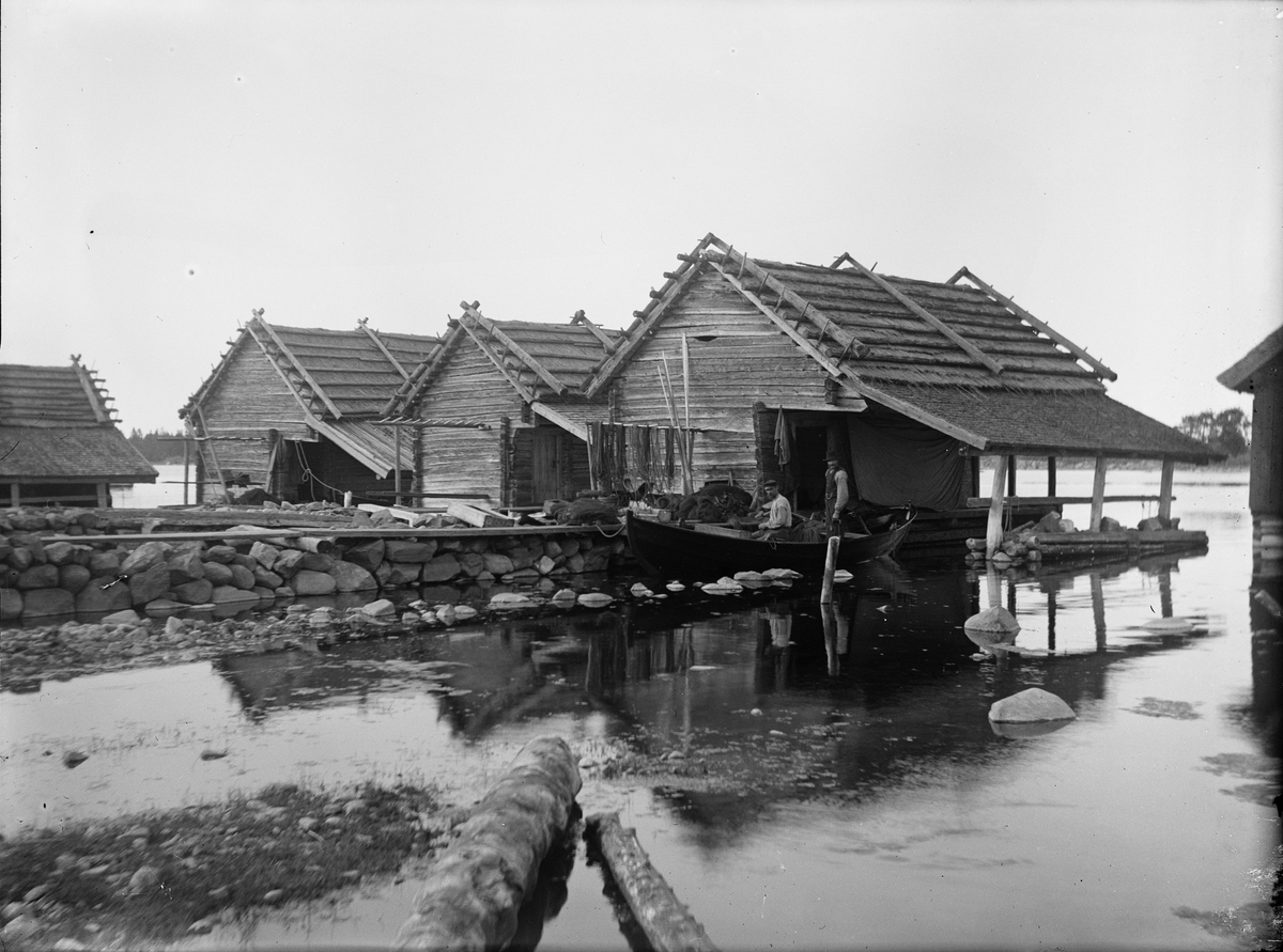 Sjöbodar med båtlänningar i Storhamn, Fågelsundets fiskehamn, Hållnäs socken, Uppland