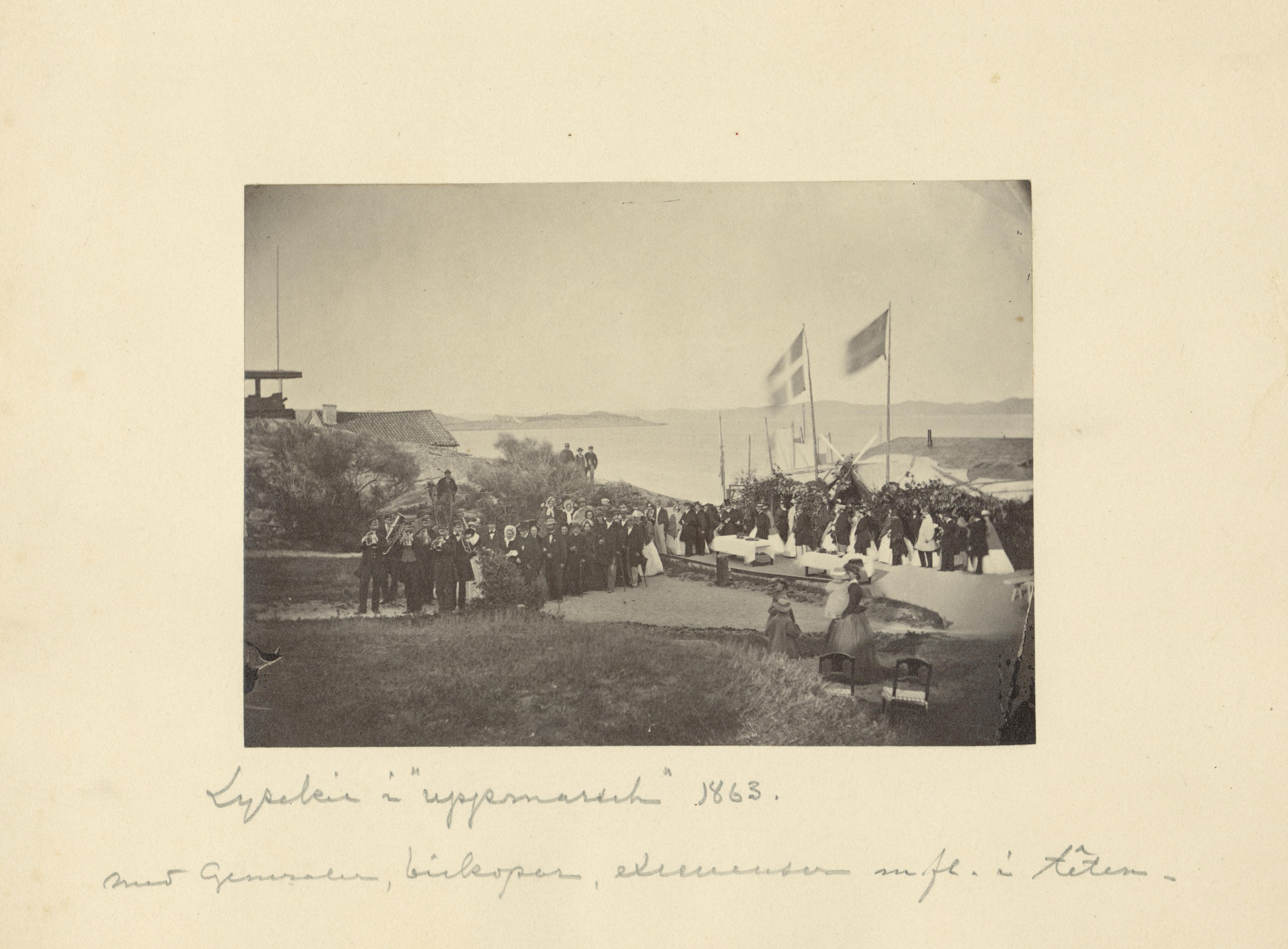 "Lysekil i uppmarsch 1863 med Generalen, biskopen, excelensen m fl i täten". Blåsorkester till vänster i bild.