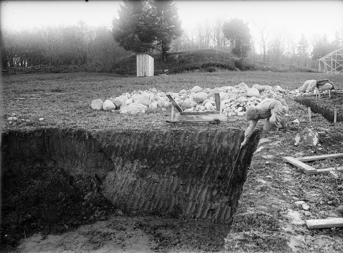 Titel: Grundläggningsarbetet påbörjat, friluftsmuseet Disagården, Gamla Uppsala 1928 - 1929. Man mäter gropens djup