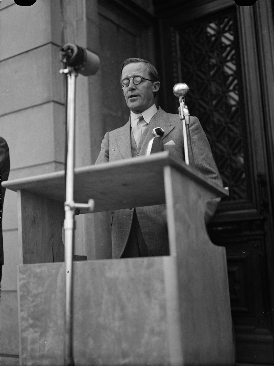 Professor Frede Castberg talar vid firandet av Norges nationaldag 17 maj, Universitetshusets trappa