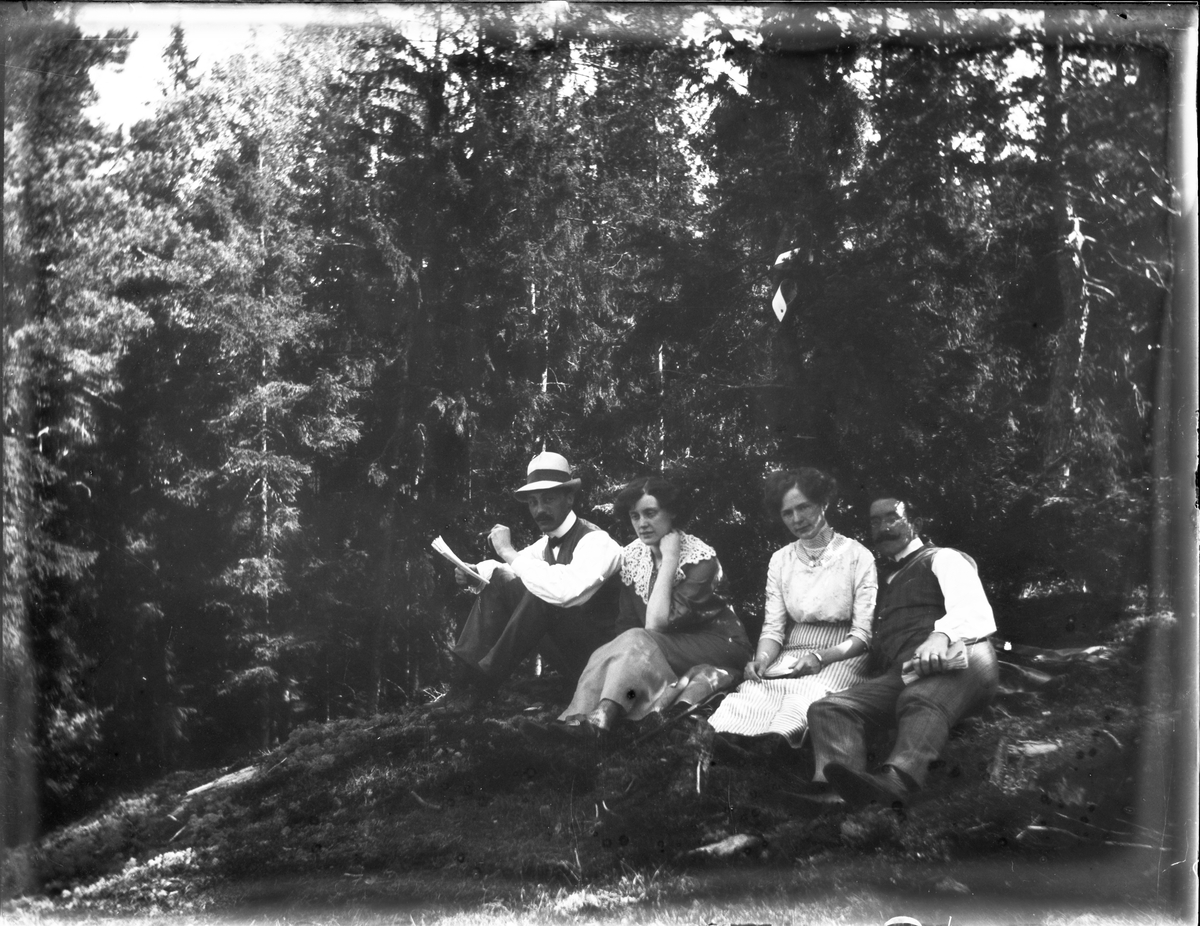 Två kvinnor och två män sitter i skogsglänta, Sätra brunn, Sala