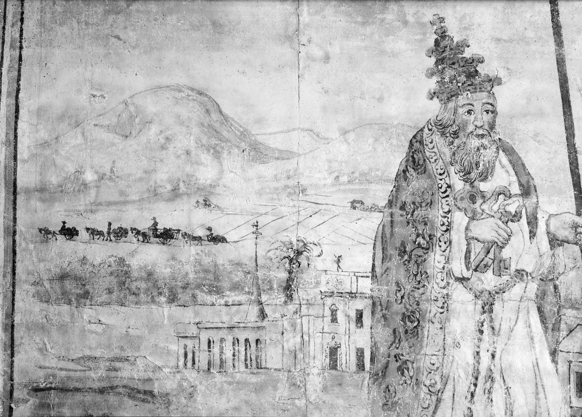 Detalj av väggmålning av allmogemålaren Hans Wikström i Bärbystugans sal, friluftsmuseet Disagården, Gamla Uppsala 1941