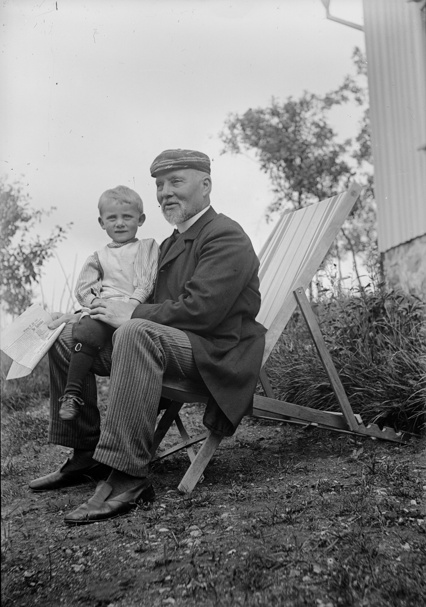 Christiane Liljefors far Roland Pedersen, med sitt barnbarn Roland Liljefors, sitter ute i trädgård, sannolikt i Norge