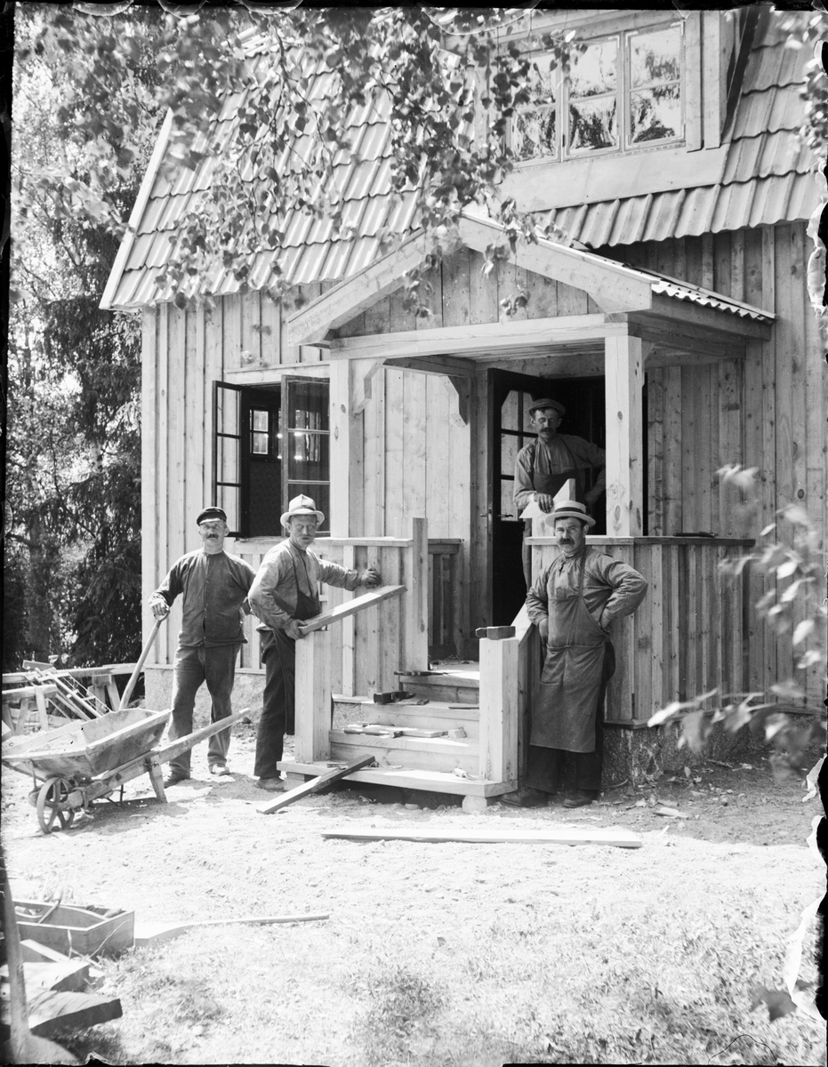 Fyra män arbetar med att bygga en förstukvist, Uppland