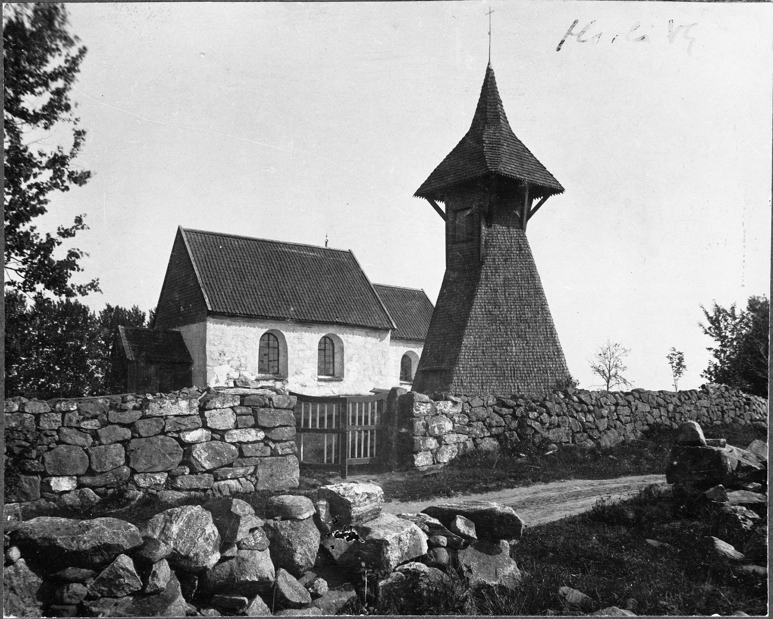 Kyrkan från sydväst, med klockstapeln i förgrunden.